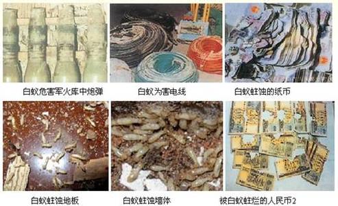 白蟻還能危害圖書、文物、織物、武器、帳冊(cè)、錢幣、地下電纜等,造成重大損失。古廟宇的大梁被蛀斷,地下通訊電纜被蛀造成電信中斷,銀行金庫(kù)也難以幸免,人民幣被蛀等。